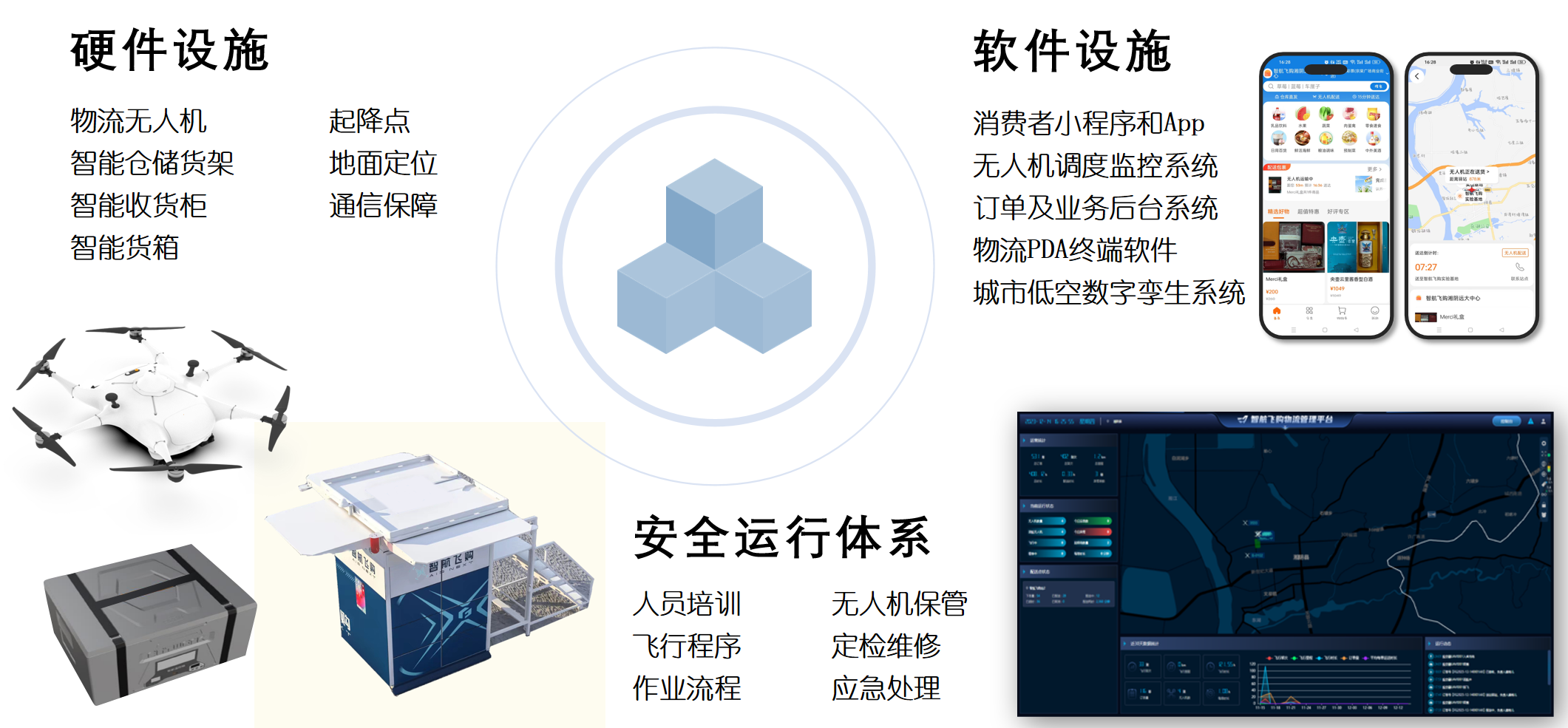 “智航飞购” 采用“物流调度平台+即时零售商业平台”双平台的架构,实现了基于三维数字空域和城市孪生的航线规划、集中调度、应急预警处置、对多无人机型号的融合以及从仓储、打包配送、末端派发的业务整合闭环能力、并且具备2C的大规模业务并发处理能力。