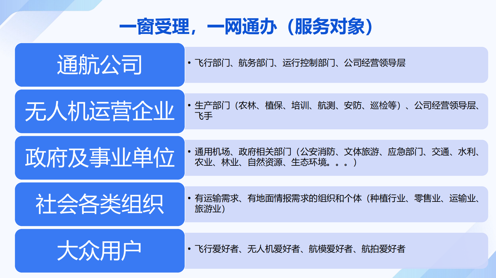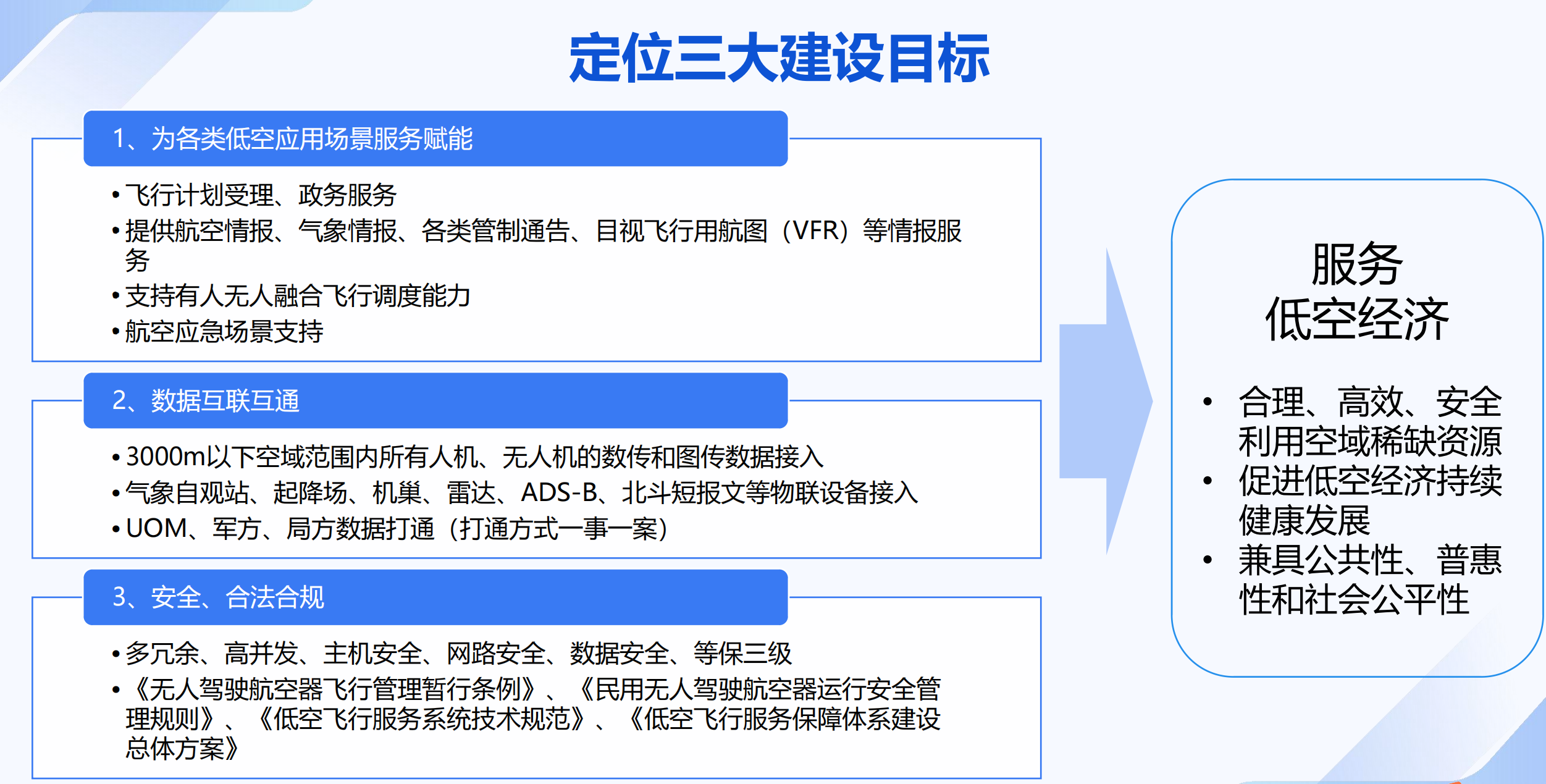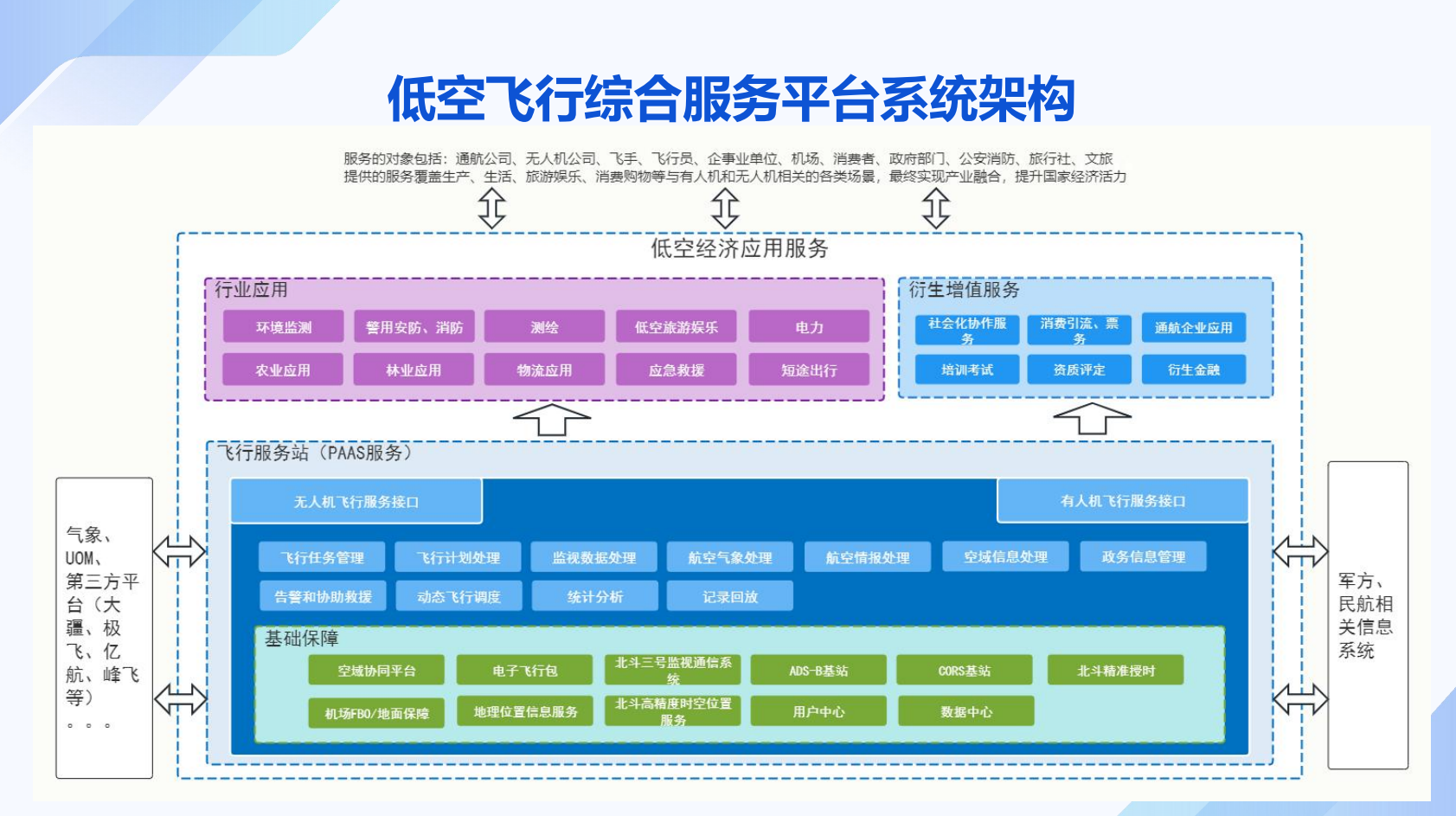 对全市3000米以下空域进行分类划设等;主要功能或目标;对全市低空飞行服务中心现有系统及设备升级,符合《低空飞行服务系统技术规范》中A类飞行服务站功能要求;与国家无人驾驶航空器一体化综合监管服务平台(UOM)联通,达到USS的I级服务标准要求:系统具有空域精细化管理等功能;对飞服中心新场址建设;建设市一级低空产业场景化展示平台。对全市3000米以下低空空域进行低空飞行服务中心建设项目,分类划设并制定协同运行行办法及目视飞行方法等;需满足的要求:与军民航管理系统联通,在全市低空飞行服务中心满足有人机和无人机等低空飞行活动“一窗受理,一网通办”等。低空产业场景化展示平台满足不同单位不同场景数据接入,制定统一的系统框架和接口数据规范标准等。空域划设和系统管理满足空域精细化管理要求,实现空域资源共享、统筹使用、有效利用,促进全市低空空域安全有序发展,实现空域管理需求等。监视和通讯设施建设满足全市低空空域覆盖。